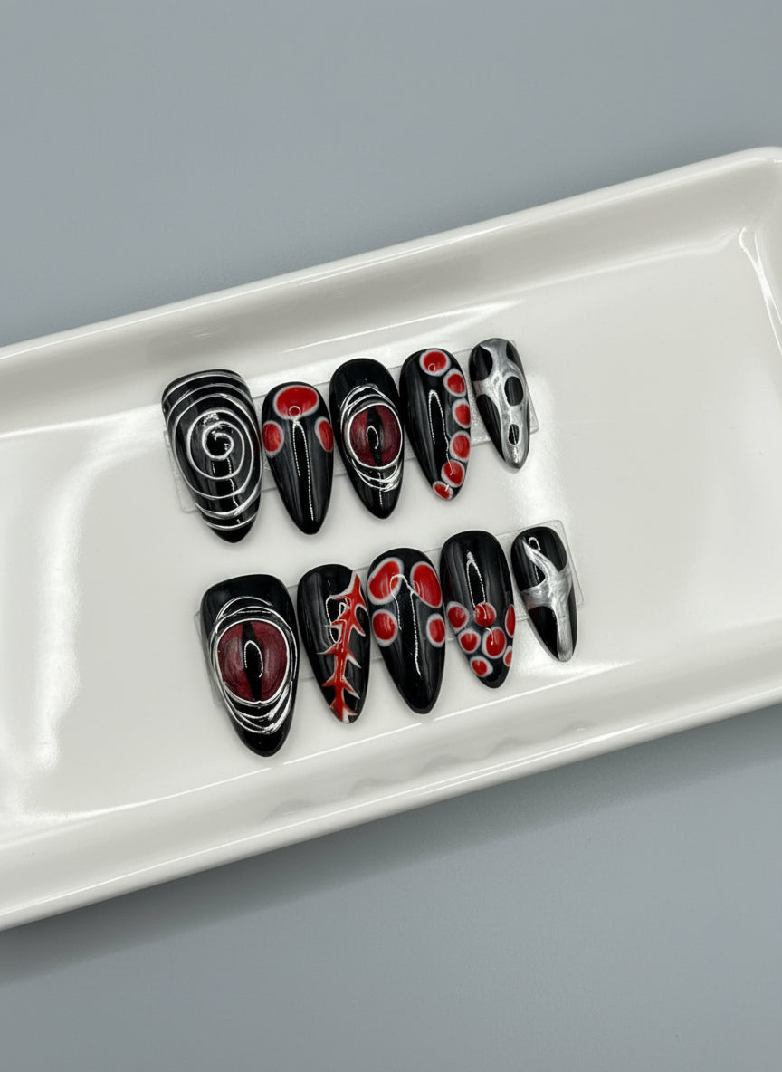 Dark and daring, Blood Moon fuses black and crimson with silver line art and eerie abstract patterns. Inspired by lunar eclipses, this set is pure mystery and power.
