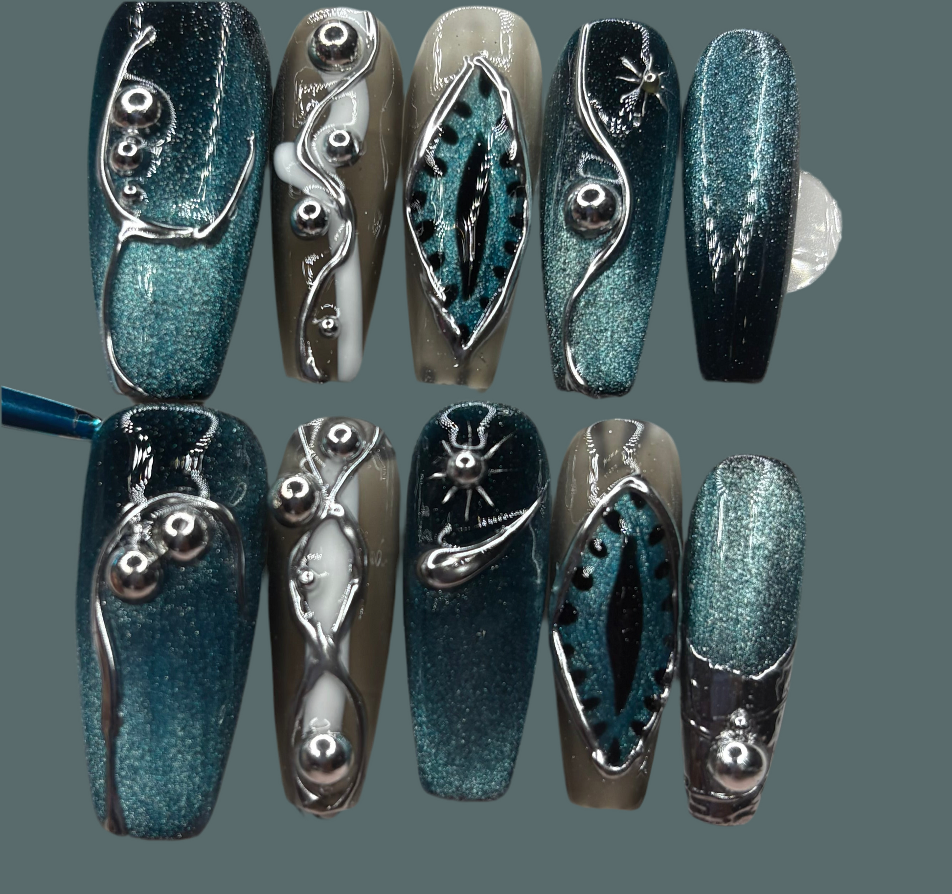 A bold collision of metallic shadows and silver light, made to steal every glance.