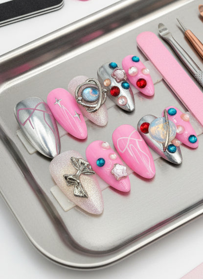 Hot pink collides with silver chrome and gemstone bubbles in this galactic fantasy. Cosmic Crush is for the bold spirit who doesn’t mind a little chaos in her charm.