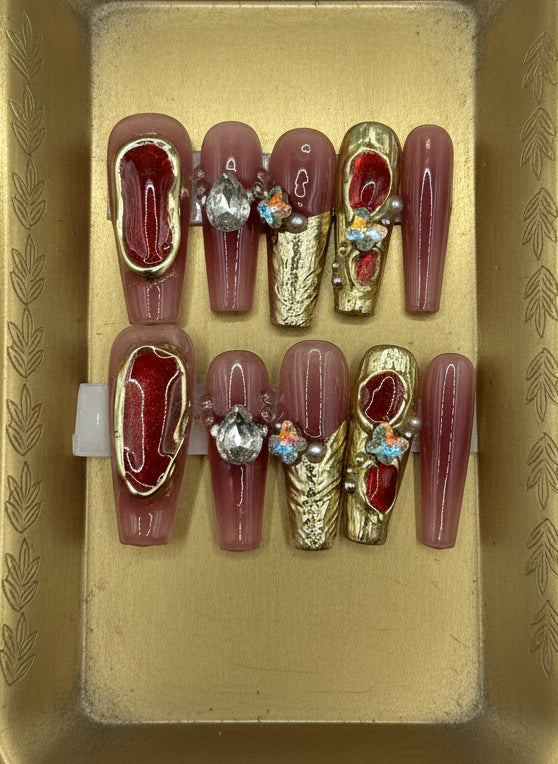 Step into luxury with Red Reign — a royal fusion of molten gold, ruby red chrome, and crystal embellishments that demand attention. Each nail is handcrafted to embody power, passion, and prestige, giving you the look of modern royalty. Whether it’s for a gala, date night, or your next statement moment, this set makes sure you rule the room.