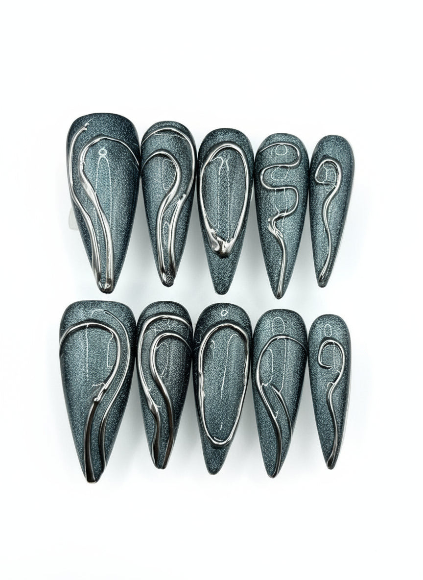 Sleek, bold, and futuristic — Liquid Chrome drips in silver metallic detailing over a smoky graphite shimmer. This sculpted look brings a high-fashion edge that’s both edgy and refined.