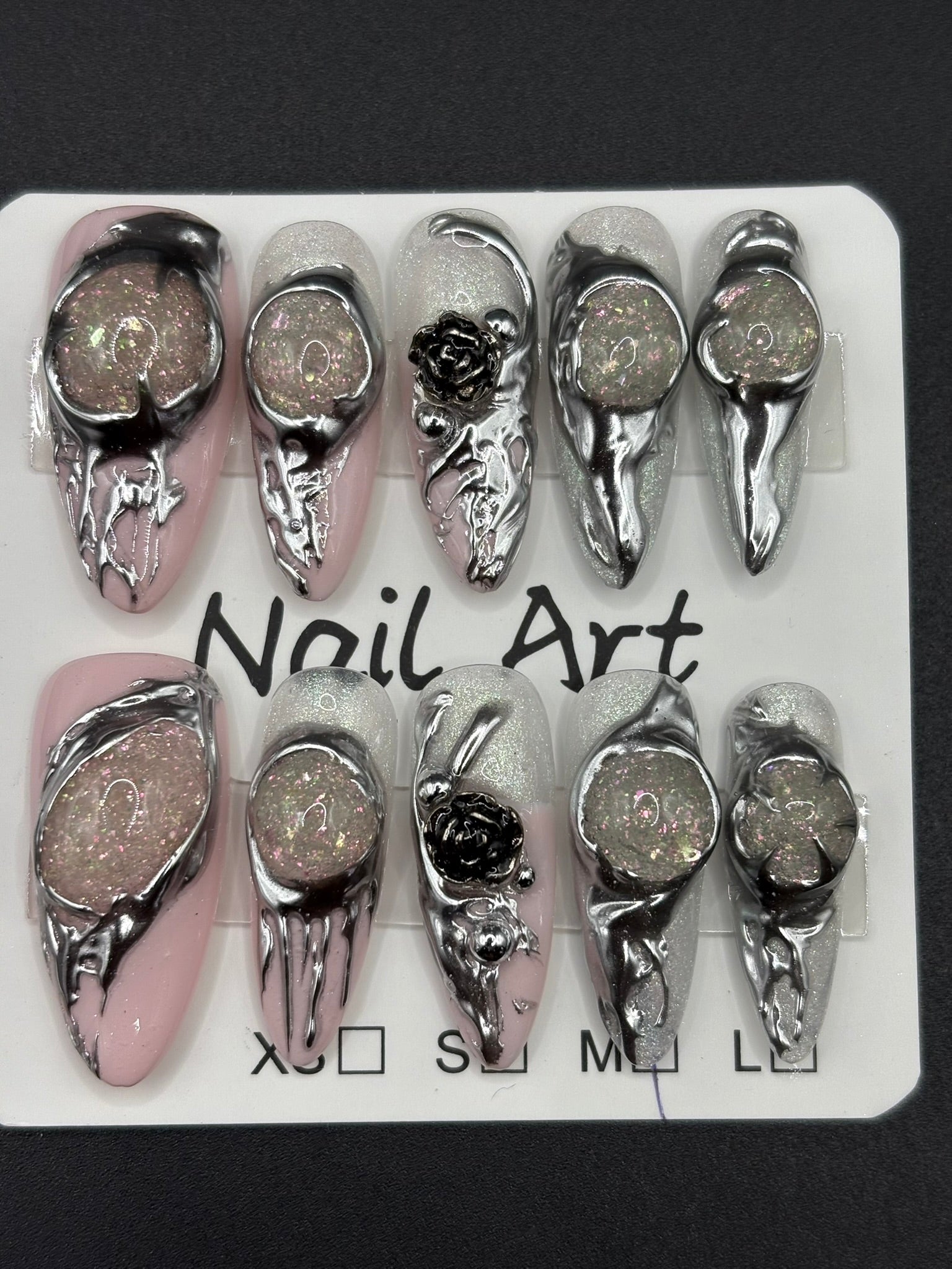 Iridescent orbs and silver molten metal designs come together for a cosmic statement. Molten Moon glows like liquid chrome under the light — fierce and otherworldly.