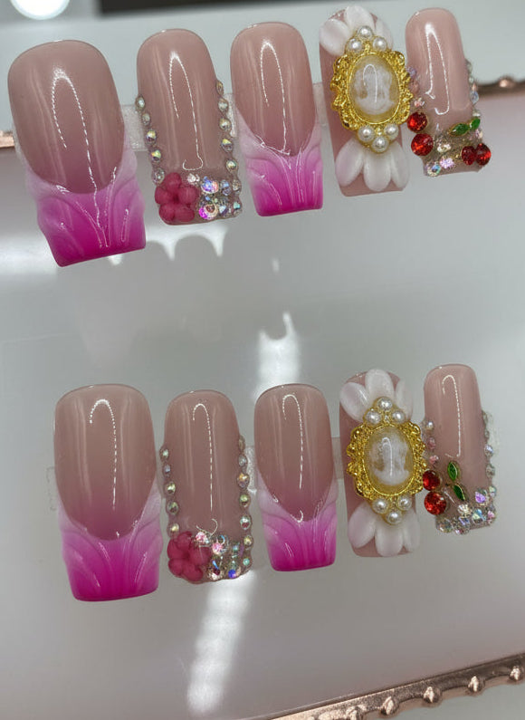 A masterpiece of detail and luxury. Royal Muse features pink sculpted tips, jeweled accents, pearls, and gold framing — a wearable art piece inspired by vintage crowns and baroque beauty.