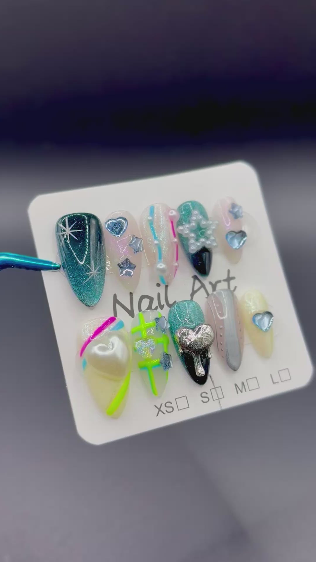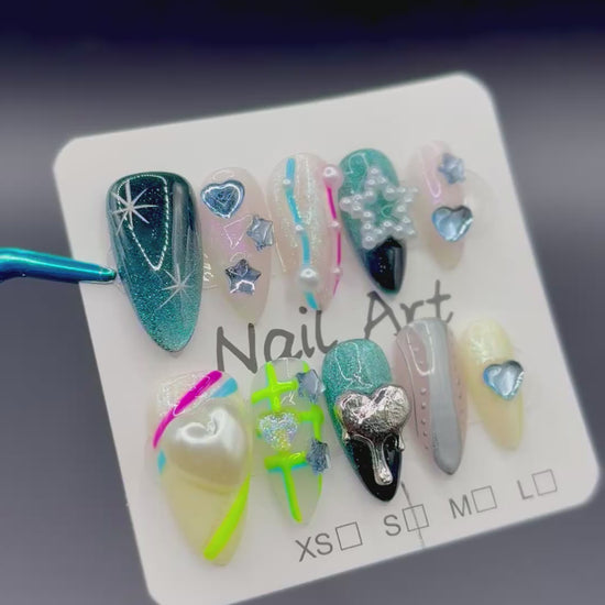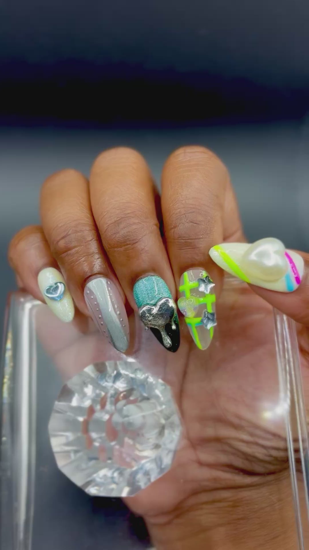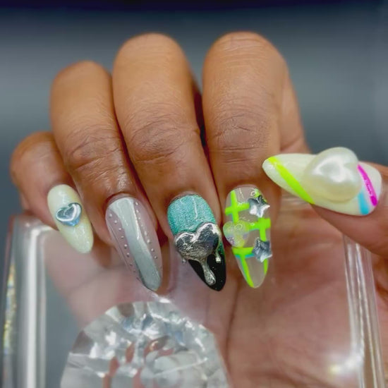 Drift through galaxies with Star Chaser — a futuristic blend of metallic hearts, glowing neons, star-studded details, and glossy pearls. This set is for the dreamers, the night owls, and the cosmic flirts. Wear it when you’re chasing something bigger than Earth energy.