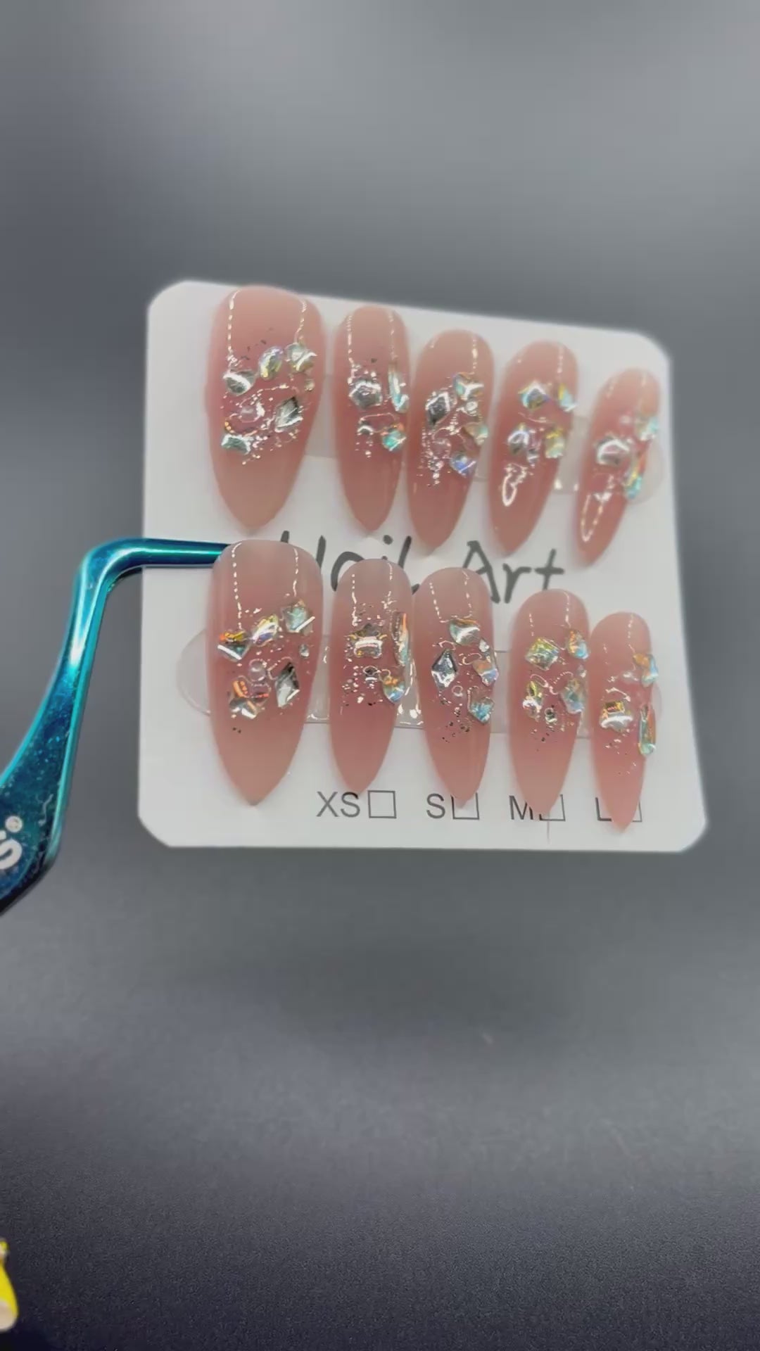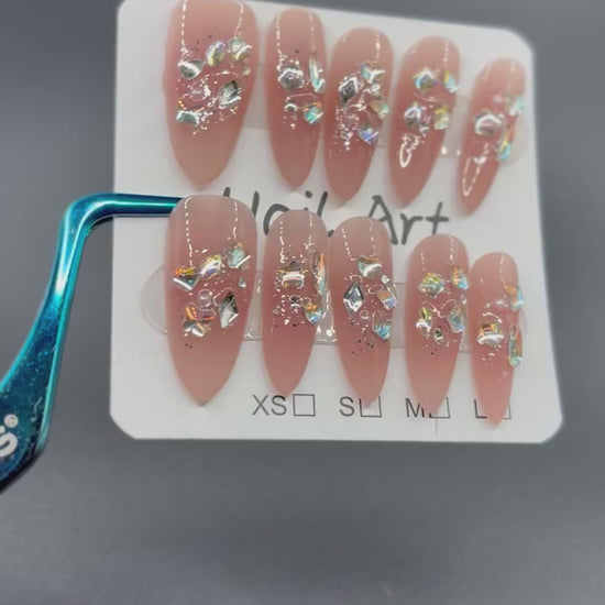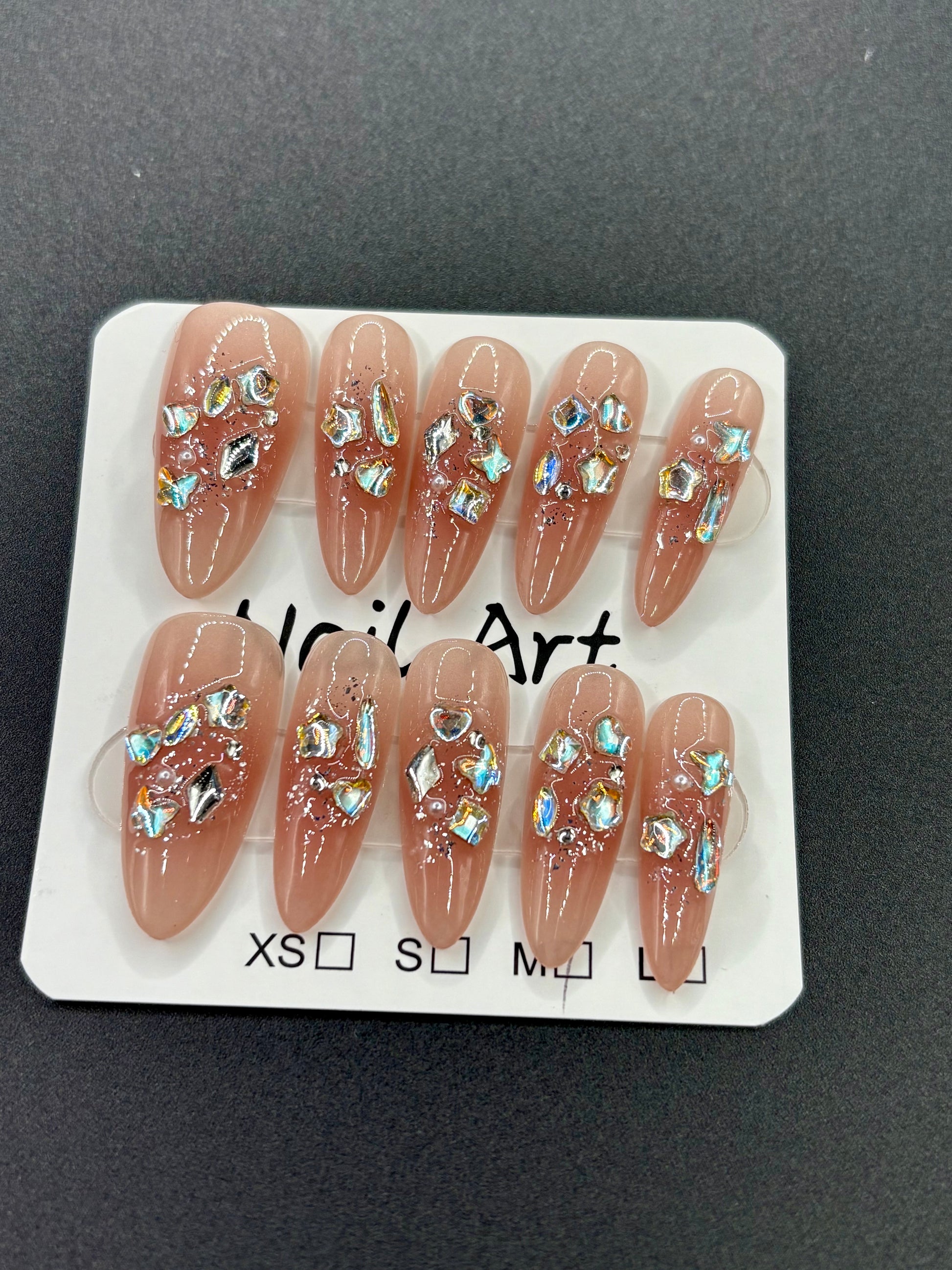 Unlock elegance with Treasure Tips — a rich nude base adorned with multidimensional crystals that catch the light with every move. These press-ons serve luxury, shimmer, and sophistication in one sleek set. Perfect for nights out or just feeling like a gem every day.