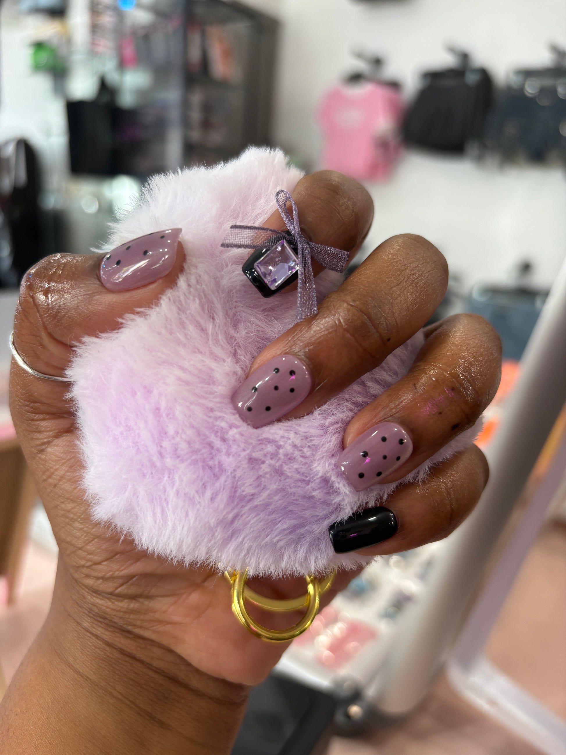 - Soft lilac base with playful black dots and bold black accent.