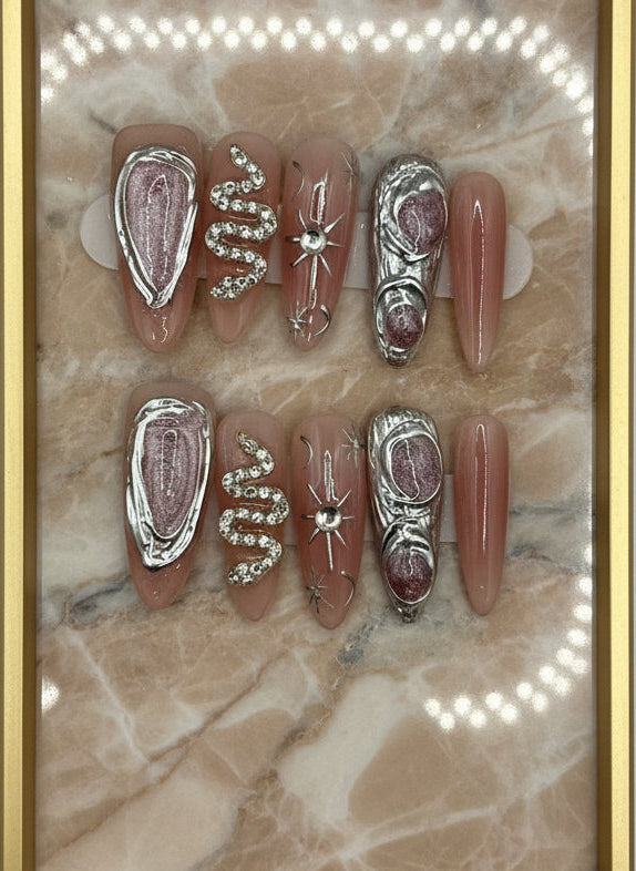 Nude tones laced with silver chrome snakes and gem-studded details. Venom Kiss embodies danger, desire, and divine confidence.