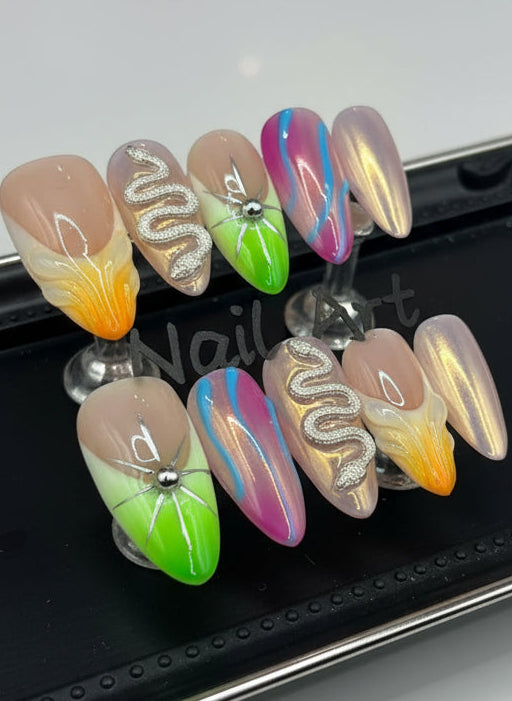 Dangerously beautiful. Venom Kiss mixes neon green, hot pink, and orange flames with silver snakes and web accents — a fierce combination of fire and venom that slays from every angle.